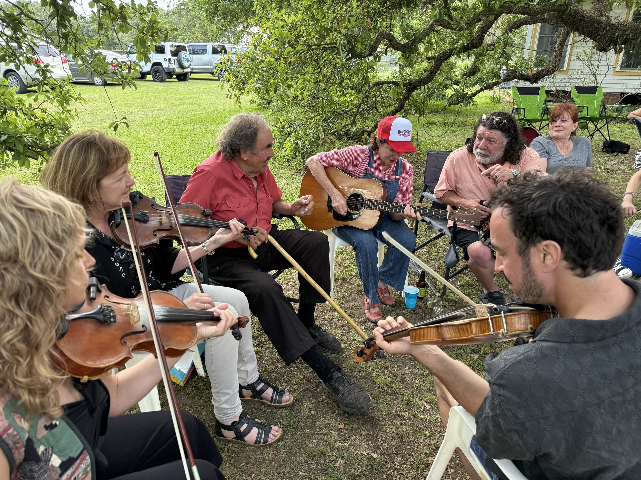 This afternoon we're invited to Marc & Ann Savoy’s country home for an exclusive Crawfish Boil on the Savoys' farm with their neighbors, family and friends - not open to the public! Spend a lazy afternoon under the trees listening and dancing to great Cajun music played by the Savoy Family and friends. Mingle with locals drinking Louisiana brew and eating obscene amounts of crawfish, potatoes and corn piled high on long wooden tables outside while hot chicken sizzles on the BBQ. YUM! No wonder Marc & Ann and the entire Savoy family look forward to this annual feast!